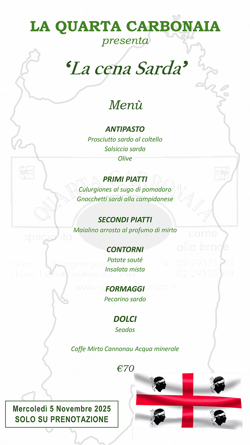 La Quarta Carbonaia propone un menù ricco e gustoso, per gli amanti dei sapori autentici e nostrani. Goditi un viaggio gastronomico fatto di eccellenze culinarie, parti dagli antipasti e concludi con il dolce, senza dimenticare il giusto accompagnamento con un ottimo calice di vino.